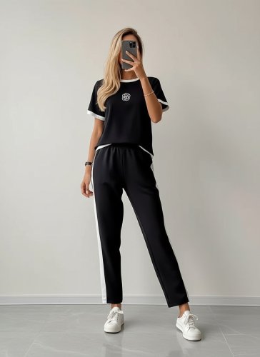 Kadın kısa kollu bisiklet yaka viskon iki iplik bluz ve pantolon ikili takım