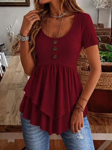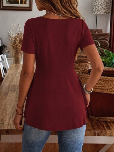 • Kadın kısa kollu yuvarlak yakalı düğmeli önden asimetrik kesim detaylı viskon bluz
